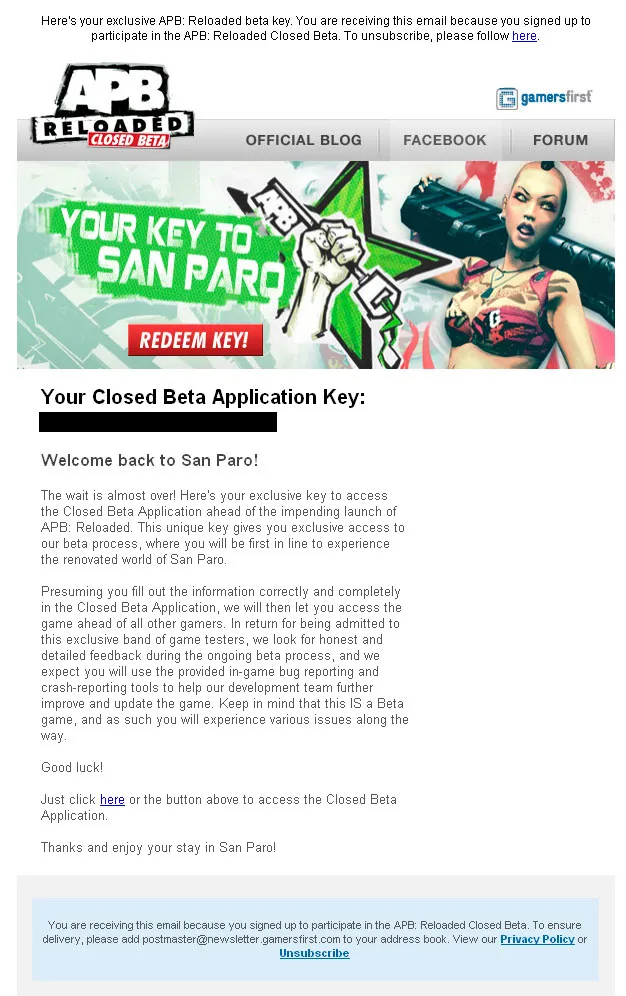 Данное письмо, опять таки, не гарантирует вам 100% попадание на бету APB Reloaded. В скором времени, будет производиться отбор среди анкет, и если вы подойдёте по критериям, ваш G1 активируют для участия в ЗБТ, а на почтовый ящик придёт письмо с инструкциями и ссылкой на бета-клиент APB Reloaded.