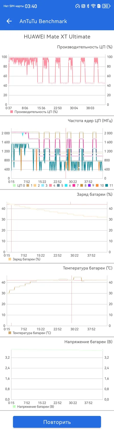Что касается производительности, то тесты показывают очень хорошие результаты. Но важно при этом учитывать, что в режиме смартфона (когда устройство сложено и задействована только треть большого экрана) Mate XT работает в среднем на 17% быстрее, чем когда он развёрнут как планшет. Более того, инженеры Huawei, похоже не до конца продумали охлаждение устройства — оно очень сильно греется, особенно в планшетном режиме. Для последнего бенчмарк Antutu даже не смог завершить стресс-тест, поскольку девайс перегревался.