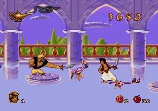 Противники не слишком разнообразны: помимо нескольких достаточно слабых «боссов», уровни под завязку забиты стражниками, змеями и попугаями. Разбираясь со всей этой братией, мы должны собирать различные иконки: улыбающийся Аладдин – плюс жизнь, гримасничающий Джин или «невозмутимый» Абу – мини-игра в перерыве между двумя уровнями основного действа. Первый нам предлагает простенького «однорукого бандита»: выиграть можно и драгоценный камень, и жизнь, но кислая морда Джафара сразу же сворачивает незаконную игровую точку. Абу досталось развлечение поинтереснее: он бегает с мечом наперевес и собирает разные вкусности для своего хозяина. Процесс, правда, завершается сразу после того, как мартышка получает первое ранение…