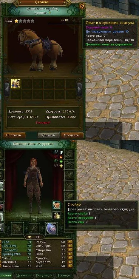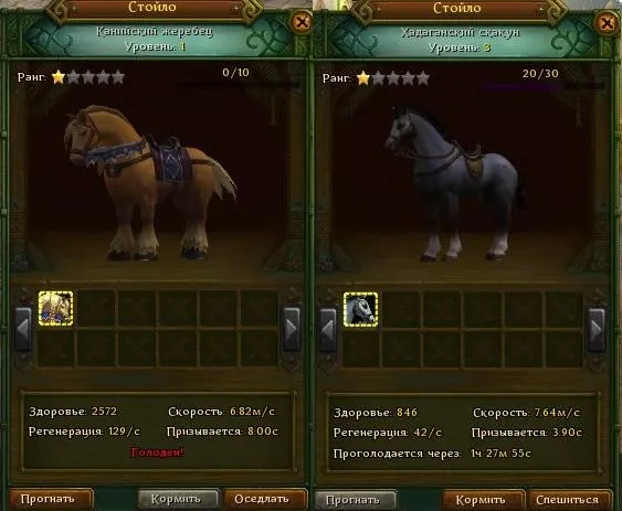 При кормлении питомца увеличивается его опыт и как следствие - уровень. В день можно съесть 48 порций корма и получить соответствующее количество опыта (1 порция накормит лошадь на 30 минут, максимальное время сытости 1,5 часа). При дальнейшем кормлении лошади, очки опыта в этот день получаться не будут. При чувстве голода характеристики скакуна временно понижаются.