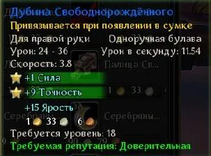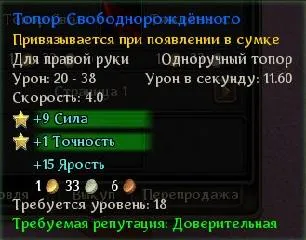 Этаким “стандартом” одноручного орудия на более низких уровнях является оружие полученно в награду за репутацию. Но эти оружия различаются по типу и характеристикам, а поэтому на примере наград за оружие фракции “Свободорожденные” хотелось бы показать, что с помощью одинакого (или почти одинакого) по урону оружия можно компенсировать недостаток определенных характеристик.