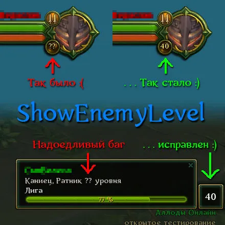 Кроме того, показывает уровни в всплывающей подсказке при наведении мыши на персонажа чужой, и даже своей фракции (исправляя, тем самым, баг АО, т.к. игра показывает '??' в подсказке даже для своих хаев).