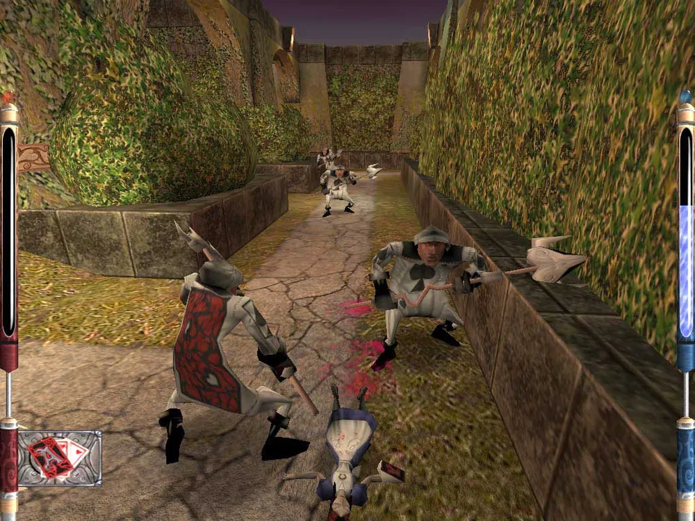 Несмотря на благие намерения Алисы восстановить разрушенное и помыть запачканное, есть существа, которых подобный расклад не устраивает. Руководит ими Червонная Королева, и действую противники по обстоятельствам, пытаясь как можно больнее укусить хмурую девушку. Разновидностей миньонов злой повелительницы разработчики наклепали предостаточно, приложив максимум выдумки и исковеркав существ из первоисточника. Так, за время экскурсии по обшарпанной Волшебной Стране чаще всего надоедают стражники-карты (которые забавно расчленяются при метком попадании) и армия красных шахматных фигур. Среди местного зоопарка можно повстречать муравьев, одетых в стиле Гражданской Войны в Америке, или снарков, местных пираний с очень скверным характером. Но больше всего неприятностей доставляю летающие монстры, например буджумы (поразительно мелодичное название), предпочитающие подолгу не зависать над одним местом и атаковать неожиданно. Изрядно попортят кровушки и механические пауки, укус которых вызывает забавную галлюцинацию и всячески мешает отбиваться от наседающих противников. Опасность подстерегает Алису за каждым углом. Но и мы не лыком шиты. Верный тесак помогает прорубать дорогу сквозь строи монстров, метательные карты вызывают летальный исход у незадачливых оппонентов на внушительном расстоянии, а шкатулка с секретом - мечта пиротехника - вызывает обильные ожоги. Среди арсенала можно найти удивительные вещи, такие как ружье с широким раструбом - ультимативное оружие или джентельменский набор сюрикенов со слабо выверенным самонаведением. При этом, каждый играющий волен выбрать свой метод нанесения ущерба. Смертоносные игрушки в большинстве своем наделены двумя режимами атаки, что дает простор для тактики. Никто не помешает всю игру пробежать с "единичкой", поплевывая картами и изредка нанося внушительные повреждения местым "шафтом" - Глазным Посохом. Или мы можем заигрывать со взрывоопасной шкатулкой, используя биту для крикета в качестве оружия дальнего боя. Исход конфронтации может быть решен десятками методов.
