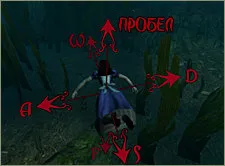Управлять движениями Алисы под водой очень просто - посмотрите на картинку, и вы все поймете. Чтобы ваша героиня поднялась к поверхности воды, одновременно нажмите клавиши движения вперед [W] и прыжка [ Пробел], а чтобы она нырнула поглубже - клавиши движения вперед [W] и ныряния [F].