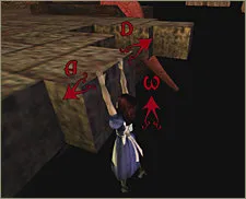 Мы стоим в «небольшом» зале с лестницей, что извивается вокруг монументальной, безвкусной колонны. Вокруг этой колонны летает Боджум, будто ужаленный. Также по лестнице шастают два стражника, идём влево, к двери с белыми фонариками, спускаемся вниз по лестнице, вы оказываетесь напротив платформы с Демоническими костями. Очень капризное оружие состоит из трёх компонентов, что должна собирать Алиса на протяжении всей игры, есть только одна атака, при которой производится вызов одного из трёх демонов, если у Вас только один компонент, Вы можете вызвать только летающего демона. Летающий демон, слабый противник дальнего боя, атакует молниями, может летать. Осторожно, сразу после того, как возьмёте кости, по Вашу душу прилетят двое Боджумов, что попытаются столкнуть Вас с платформы. По этому платформу следует покинуть. Под лестницей лежит здоровье.