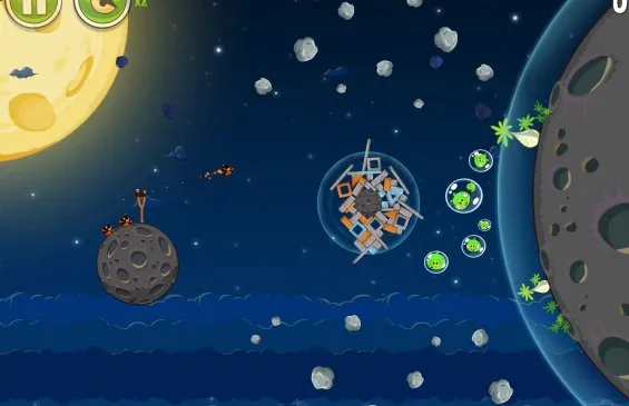 Так как наши неугомонные друзья перебрались в космос, то и учитывать нужно будет как раз то самое кардинальное изменение – гравитационные поля планет и невесомость, а также астероиды и другие неопознанные летающие объекты. Возможно, игрокам «птичьей оперы» механика может показаться слегка сложной, но вот буквально через 3-5 уровней вы крушите свинюшек, закрывая уровни 3 звездами. Чем огорчили Rovio, так это длинной линией траектории, которую они добавили в игру, что делает прохождение менее интересным и интригующим. Хотя, наверное, это и к лучшему: кто знает, сколько бы пришлось выкидывать птичек в неизведанное пространство, чтобы пройти дальше?