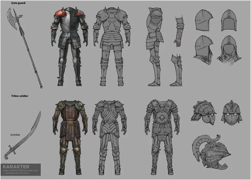 Хенрик Болле: Дизайн доспехов отнимает один день, все вместе, так сказать: прочитать брифинг, понять, набросать вид спереди и сзади, нарисовать пару деталей и, пожалуй, обработать их. Это уже что-то. И тем более нам удалось быстро выработать некий стиль, и к тому же Жан-Марк, Арт директор, очень редко высказывал какие-то экстра пожелания, касаемо доспехов. Сотрудничество было очень плодотворным.