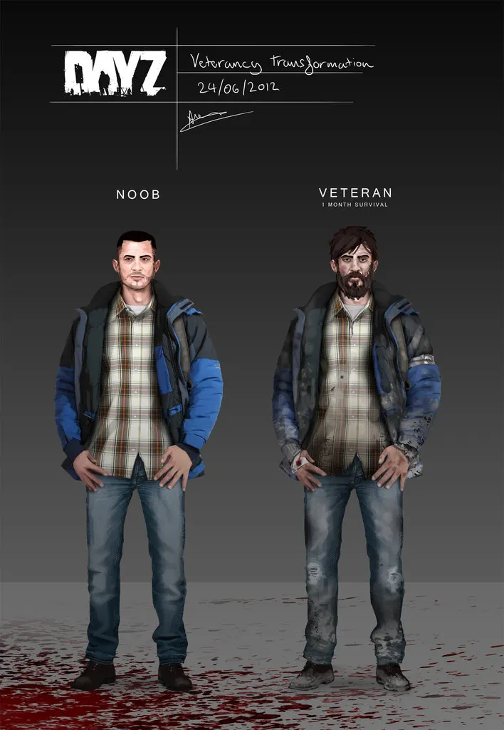 Далее идет концепт того, как визуально будет отличаться новый персонаж выжившего от опытного, много повидавшего выживальщика.