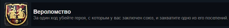 Это достижение связано с картой хитрости "Пакт союзников". Её можем применить мы сами, её могут применить на нас, тут это не имеет значения. Важно то, что пока действует этот пакт, нам необходимо захватить поселение нашего союзника и в тот же ход его убить. Именно в таком порядке, потому как убийство расторгает сам пакт.