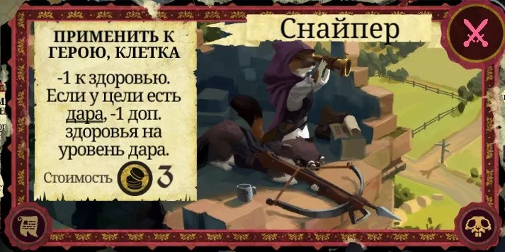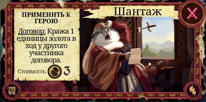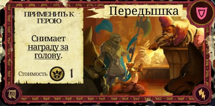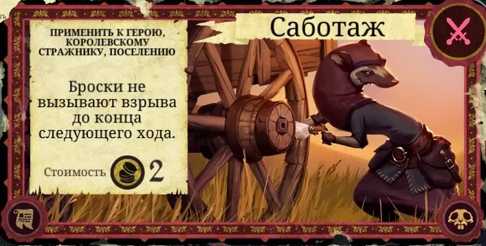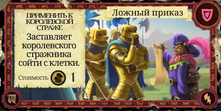 Рекомендации к применению: Если у вас есть золото - обязательно используйте. Одна из лучших карт хитрости в игре. Не раз с её помощью герои забирались во дворец и сразу же нападали на Короля (особенно прекрасно работает с Ривер, когда у Короля осталось 1 очко здоровья). Выпадает она гораздо реже, чем почти аналогичное по эффекту "Огневино" и при этом стоит золота, зато не отнимает здоровья и не прибавляет очков гнили. Карту также можно эффективно сжечь.