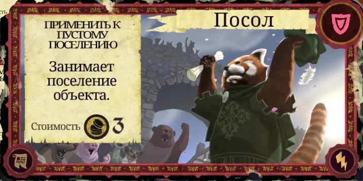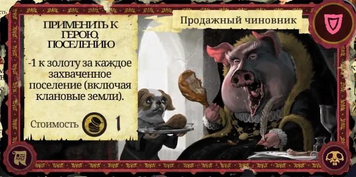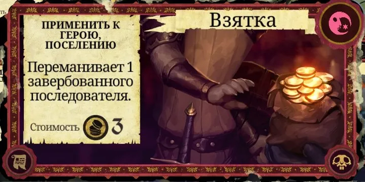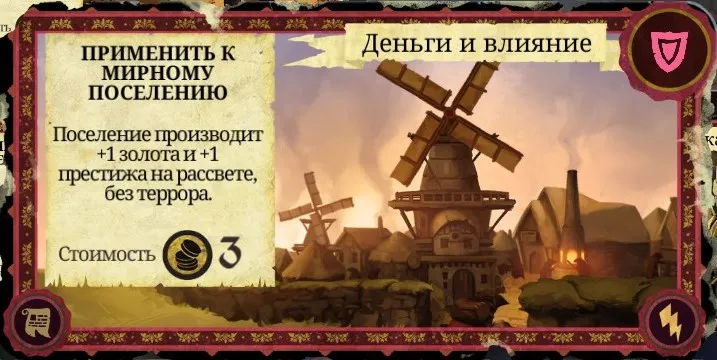 Рекомендации к применению: Если у вас есть золото - обязательно используйте. Ещё один способ, помимо "Ложного приказа", безопасно "подвинуть" стражника. И терроризируемое поселение можно освободить, получив 1 очко престижа. А Скарлет просто обожает эту карту!