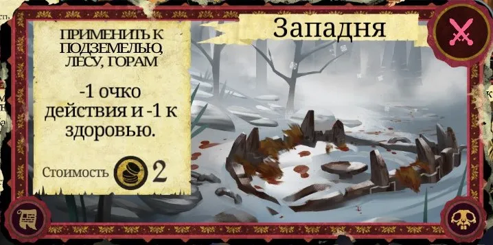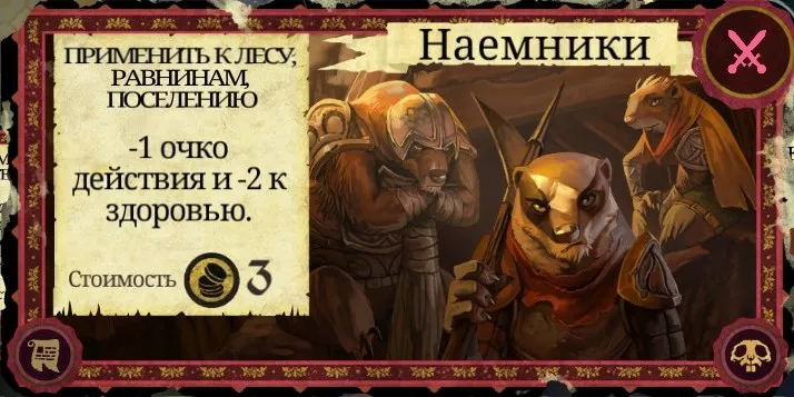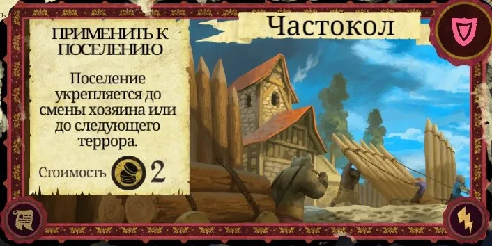 Рекомендации к применению: Если у вас есть немножко золота - обязательно используйте. Хороший способ немного защитить своё поселение или же вас в поселении. Укрепление = даёт +1 щит в бою при защите, а вход в такое поселение будет стоить персонажам 2 ОД. Карту также можно эффективно сжечь.