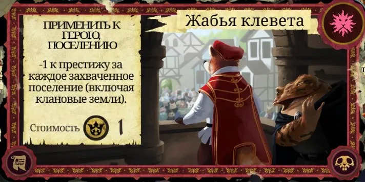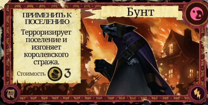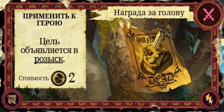Рекомендации к применению: Если у вас есть немножко золота, то используйте. Так можно отвлечь внимание стражников на противника, который вам мешает, или же применить на другого персонажа непосредственно перед нападением на него, если вы уверены в своей победе. Статусом такого героя сначала будет "правонарушитель" (1 очко престижа и 2 золота), затем с каждым новым рассветом может дважды измениться, пока герой не погибнет. После "правонарушителя" идут "злодей" (2 очка престижа и 4 золота) и "предатель" (3 очка престижа и 6 золота). Игрок, напавший на Короля, автоматически становится "предателем". Карту также можно эффективно сжечь.