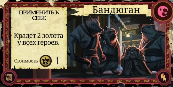 Рекомендации к применению: Если у вас есть немножко золота - обязательно используйте. Лишить противника золота - бесценно. В ином случае карту лучше сжечь.
