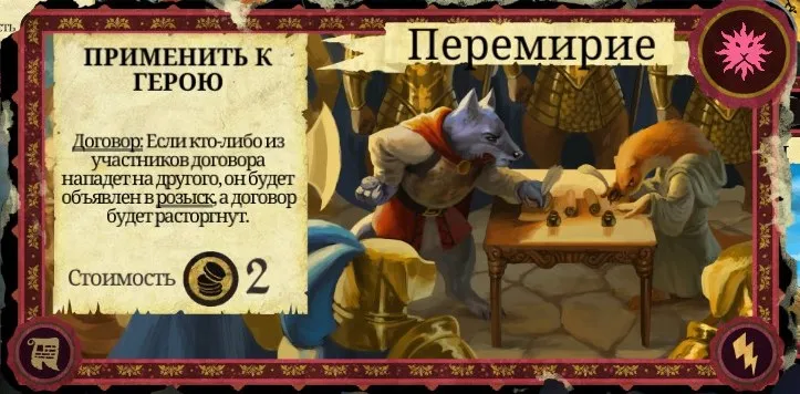 Карты хитрости со словом "договор" в описании означают, что эффект карты распространяется сразу на двоих персонажей. Эффект пропадает после гибели любого из них, причина гибели не имеет значения.