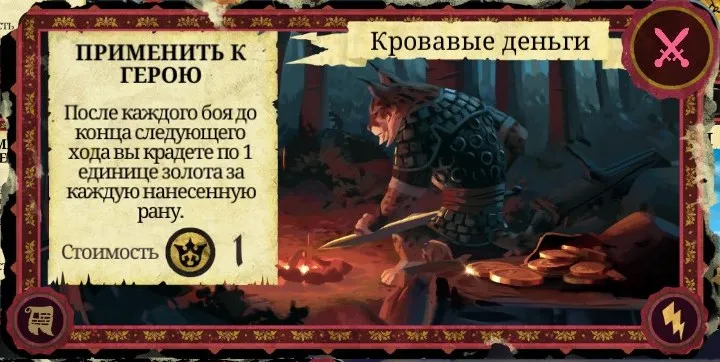 Рекомендации к применению: Если у вас есть престиж, то использовать целесообразно, если вы уверены, что сможете успешно её реализовать хотя бы в одном бою, а также если вы нападаете на героя, у которого есть деньги. Если золота у вражеского героя нет или же ваш противник - Гад, Королевский стражник или Король, то денег вы не получите. Карту также можно эффективно сжечь.