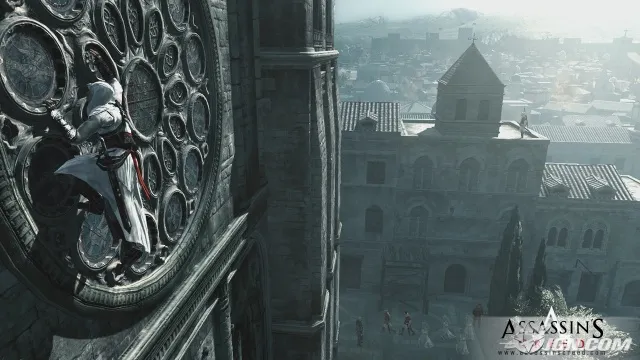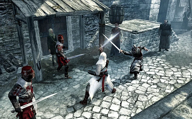 Альтаир дерется как Д’Артаньян на глазах у Констанции Бонасье: ярко, эффектно, но совершенно не естественно. Использование разнообразных приёмов, снятых отдельной камерой, и смертельных «фаталити» – всё это превращает Assassin’s Creed в этакий средневековый Manhunt с мечами вместо бит. Комбо–удары удивительно разнообразны и зависят от выбранного оружия и тактики боя: защитной или атакующей. Тактики эти можно комбинировать прямо в бою, что превращает сражения в увлекательные поединки, требующие и выдержки, и хорошей реакции, и умения грамотно оценить обстановку, вовремя приняв нужное решение. Одним словом, сражения – безусловная удача проекта: мы получили однозначно лучший симулятор чемпиона мира по фехтованию.(Статья скачена с сайта GAMEGURU)