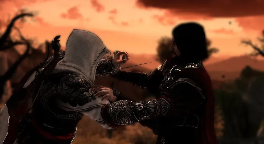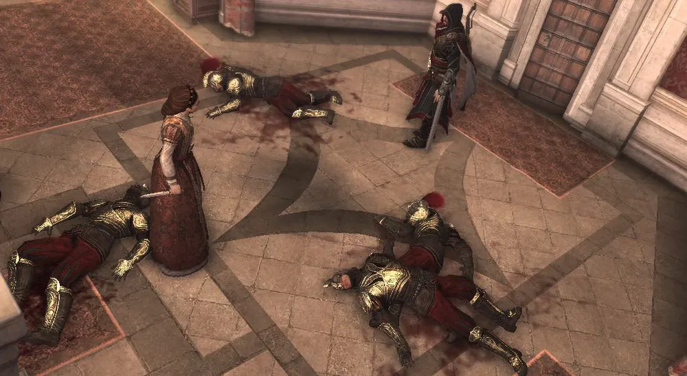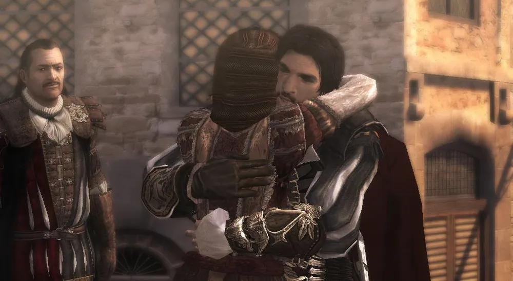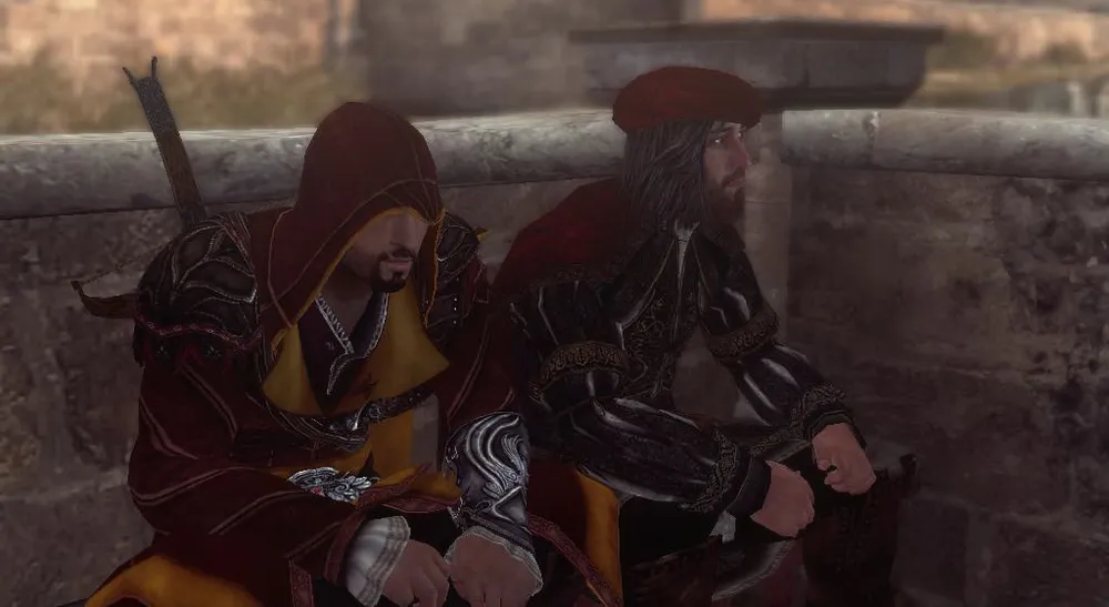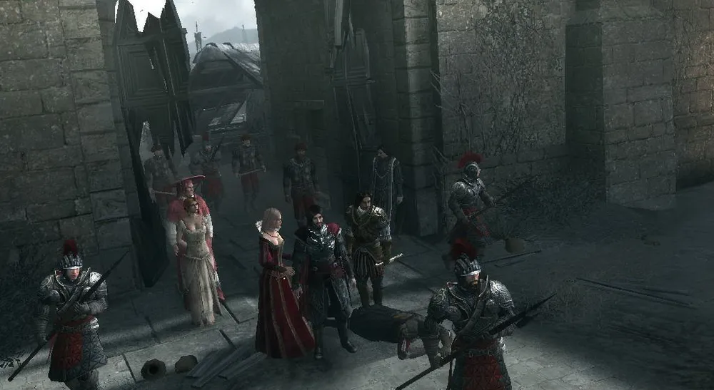Когда разобрались с громилой, солдаты Борджиа проламывают главные ворота Монтериджони и мы видим, как входит сперва Марио, а за ним Чезаре Борджиа с сестрой Лукрецией и свитой. Эцио спешит дяде на помощь, но не успевает, и Чезаре убивает Марио оружием, сделанным старым другом Эцио, и отбирает Яблоко Эдема. Краем глаза успеваем отметить, что с ними также стоит захваченная в плен Катерина.