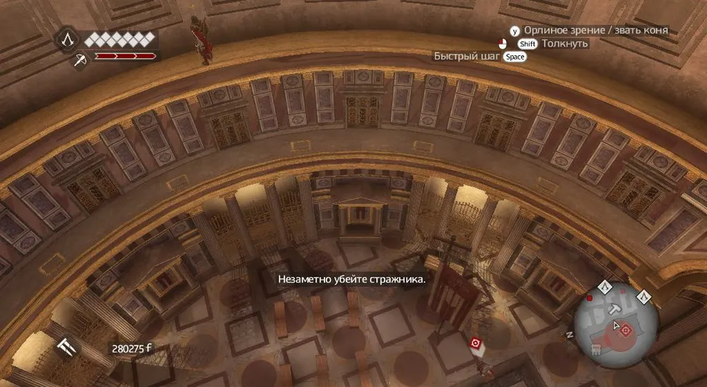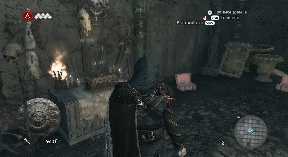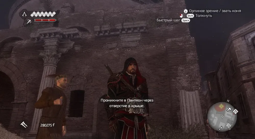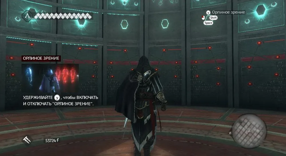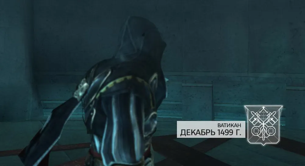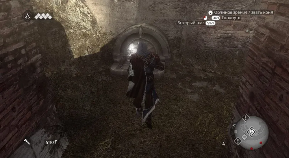 Плиты с символами вокруг нас исчезают. Бегите назад, откуда пришли. Эцио с легкой грустью разглядывает мантию Родриго Борджиа, которого он так не предусмотрительно не убил во второй части франшизы. Ассасин хочет вынуть из ниши посох, но это ему не удается и артефакт, благодаря каким-то заранее предустановленным механизмам в храме, исчезает в нише. Опускается сам пол, стены приходят в движение. Эцио пугается, но тут нас находит дядя Марио. Если не знаете что делать, следуйте подсказкам, и первая из них говорит нам, что надо включить орлиное зрение. По умолчанию – это английская «t», но радует тот факт, что в сиквеле теперь на интерфейсе вместо значков стоят наши родимые русские буквы и не нужно каждый раз заглядывать в настройки, чтобы вспомнить – а что же у нас отвечает за орлиное зрение. Нам надо идти по подсвеченной тропе. Кто, возможно, играет в данную серию игр впервые, должен уяснить, что за лазание отвечает WASD+RBM+Spase… ой, простите ЦФЫВ+ПКМ+Пробел (далее в прохождении все клавиши будут обозначаться русскими буквами - как на интерфейсе).