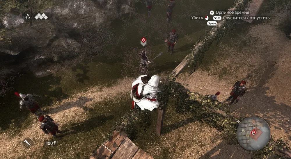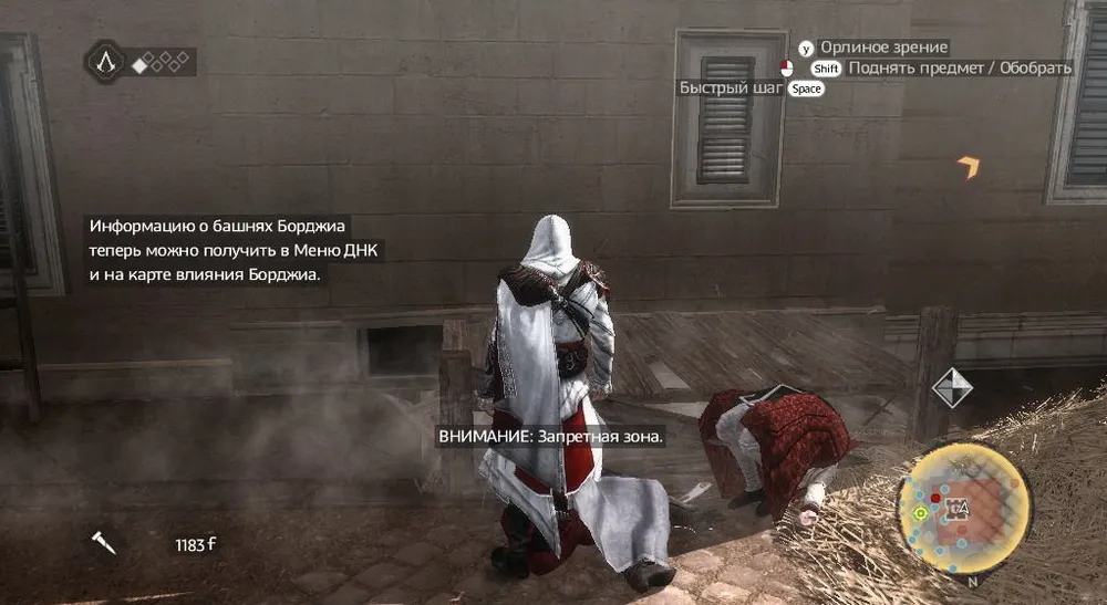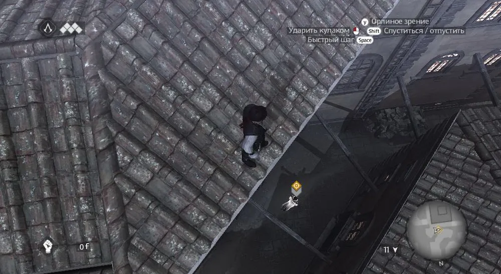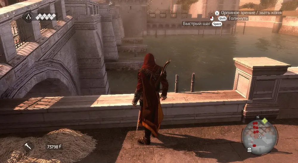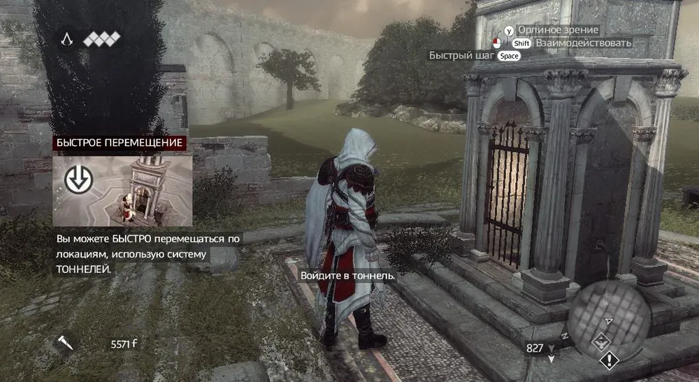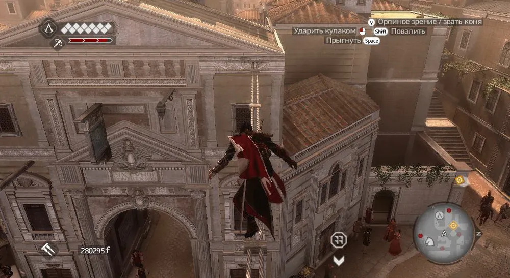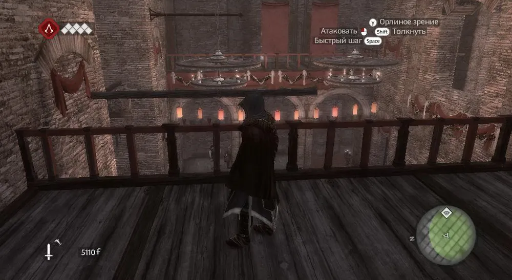 Плиты с символами вокруг нас исчезают. Бегите назад, откуда пришли. Эцио с легкой грустью разглядывает мантию Родриго Борджиа, которого он так не предусмотрительно не убил во второй части франшизы. Ассасин хочет вынуть из ниши посох, но это ему не удается и артефакт, благодаря каким-то заранее предустановленным механизмам в храме, исчезает в нише. Опускается сам пол, стены приходят в движение. Эцио пугается, но тут нас находит дядя Марио. Если не знаете что делать, следуйте подсказкам, и первая из них говорит нам, что надо включить орлиное зрение. По умолчанию – это английская «t», но радует тот факт, что в сиквеле теперь на интерфейсе вместо значков стоят наши родимые русские буквы и не нужно каждый раз заглядывать в настройки, чтобы вспомнить – а что же у нас отвечает за орлиное зрение. Нам надо идти по подсвеченной тропе. Кто, возможно, играет в данную серию игр впервые, должен уяснить, что за лазание отвечает WASD+RBM+Spase… ой, простите ЦФЫВ+ПКМ+Пробел (далее в прохождении все клавиши будут обозначаться русскими буквами - как на интерфейсе).