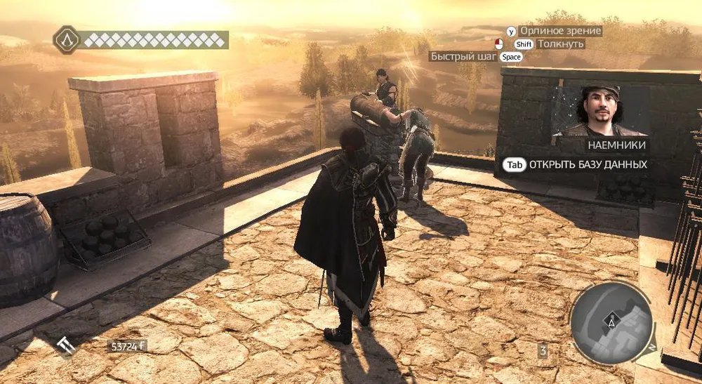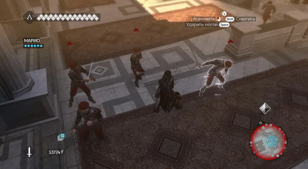 Размазываем по ступенькам стражников (много-много раз ЛКМ), следя за жизнью Марио и снова на автопятках за дядей. Марио показывает чудеса акробатики не хуже заправского ассасина, минуя стражу и прохожих, а мы не против поразмять кости на стенах все тем же ЦФЫВ+ПКМ+Пробел. Забираемся на башню.