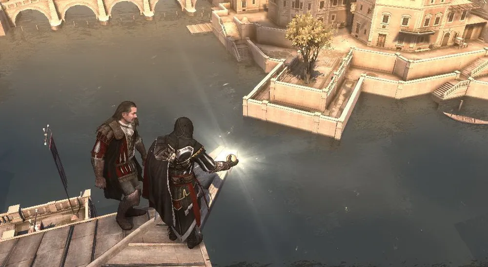 Эцио хочет бросить Яблоко в воду, но не решается и Марио забирает Яблоко себе, предоставив племяшу возможность принять решение позже. Прыжок веры в воду, звучит красивейшая музыка, красуется заставка Assassin’s Creed: Brotherhood и шоу начинается.