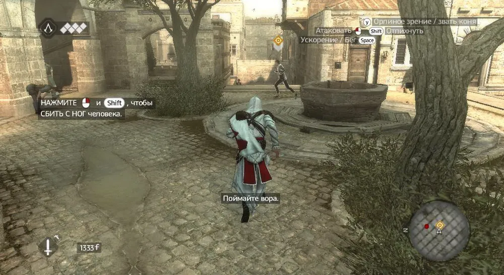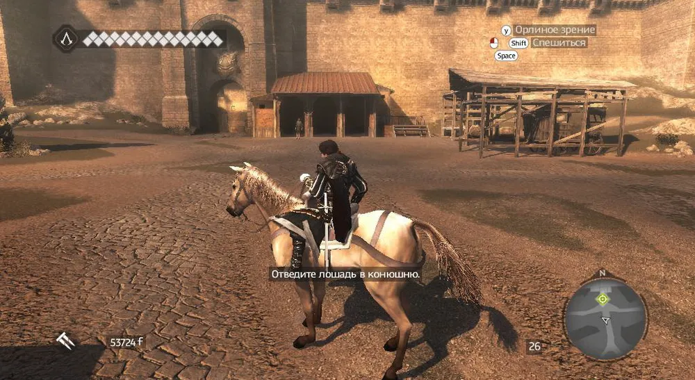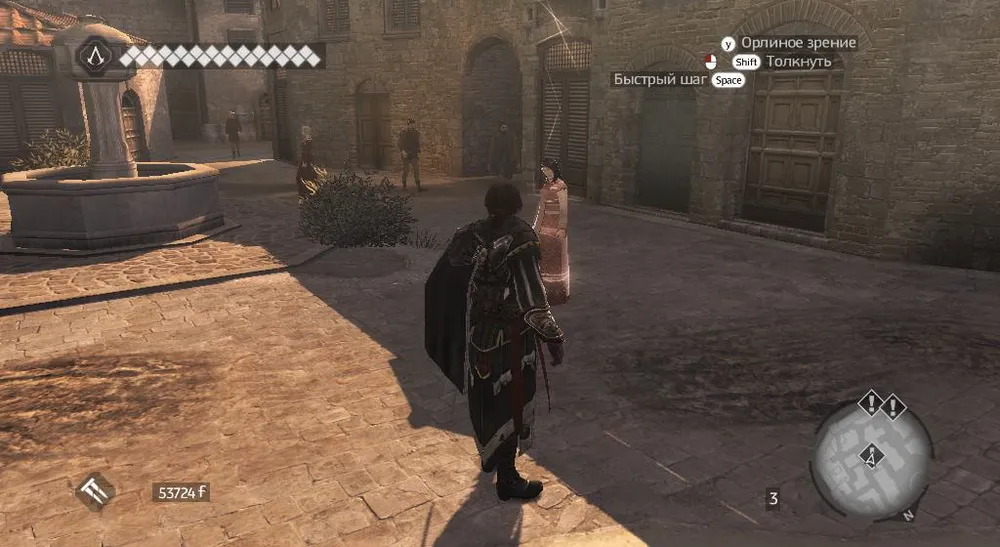 После того, как купили конюшню, садимся на лошадь (опять Shift, ага) и следуем за Макиавелли. Эцио пытается ему втолковать, что смерть Родриго ничего не изменит. Надо лишить их власти, обратившись к народу. Вера в народ – основной принцип братства ассасинов. По злой иронии воришка из народа крадет у Эцио кошелек.