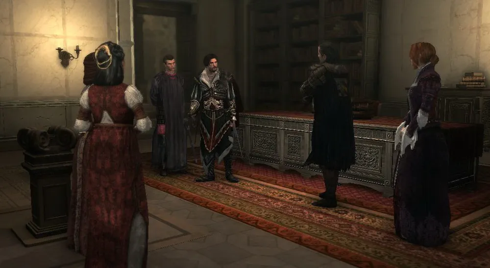 Лишь только выполнив эти три задания, нам открывается сюжетный квест. Идите к дому Аудиторе. В гостиной нас встречает Катерина Сфорца. Она предлагает заключить союз и Эцио соглашается. Вдвоем идут в кабинет, куда мы собирали страницы кодекса. Эцио обнимает маму, здоровается с Макиавелли и в тесной компании приближенных рассказывает о победе над Родриго и встрече с Минервой.