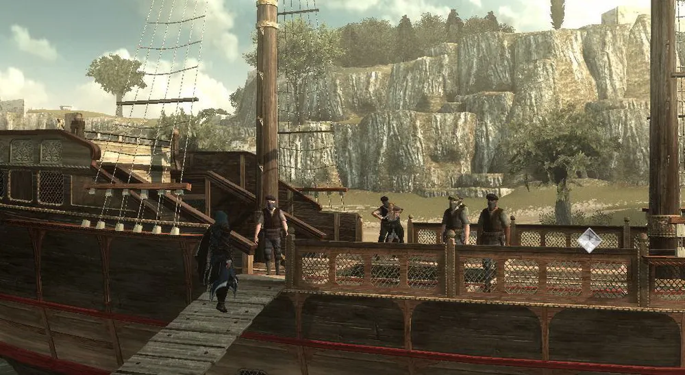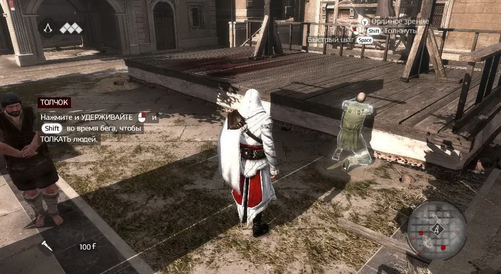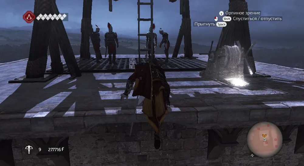 Помост – это строительные леса, что стоят возле построек. Разобравшись со стражниками, берем капитана за шкирку (Shift) и кидаем его прямо в леса (Shift), чтобы его привалило, если хотим получить 100% синхронизации.