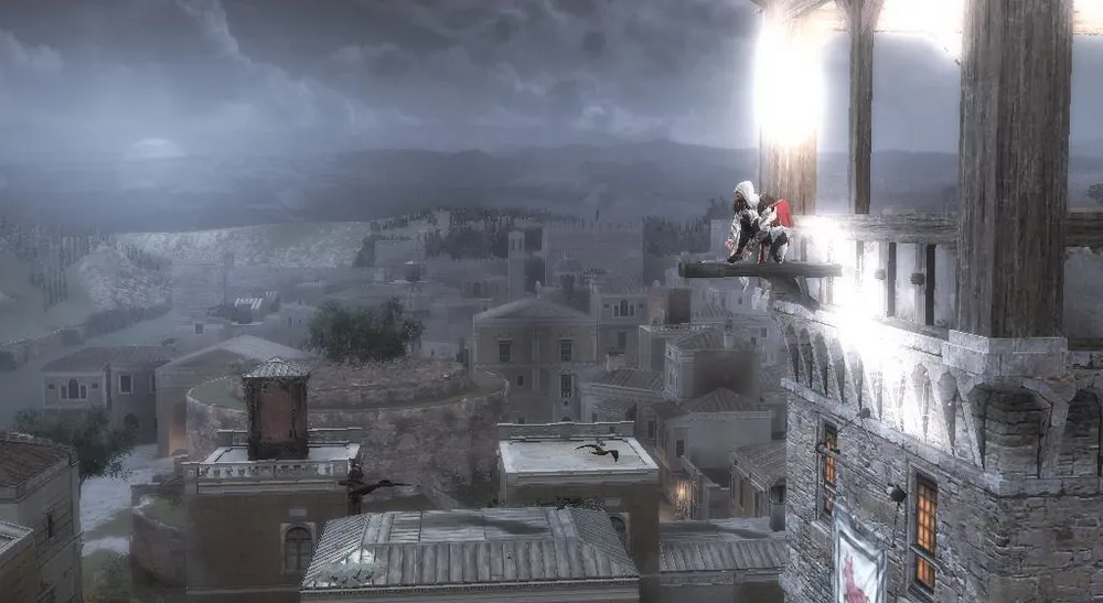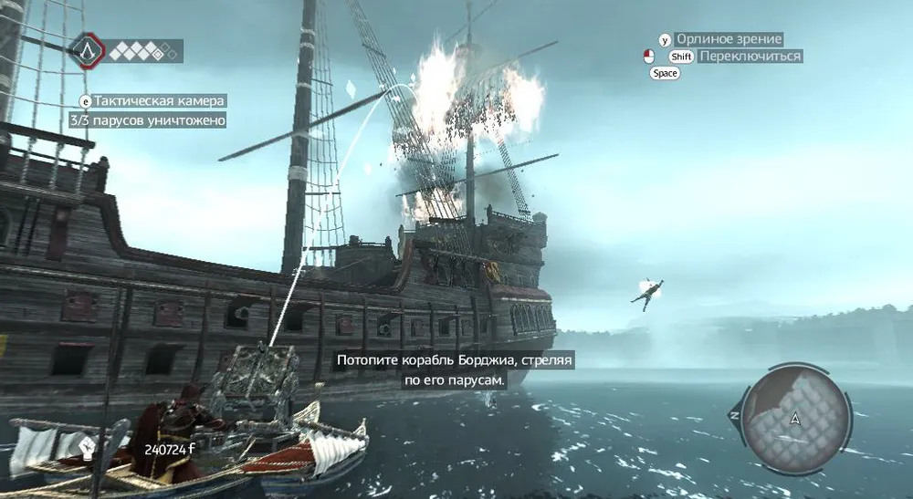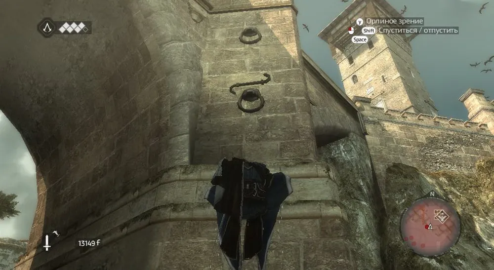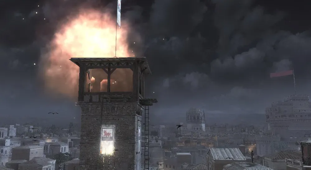Поговорив с Макиавели, снова возвращаемся к башне, взбираемся на вершину, и поджигаем ее (Shift).