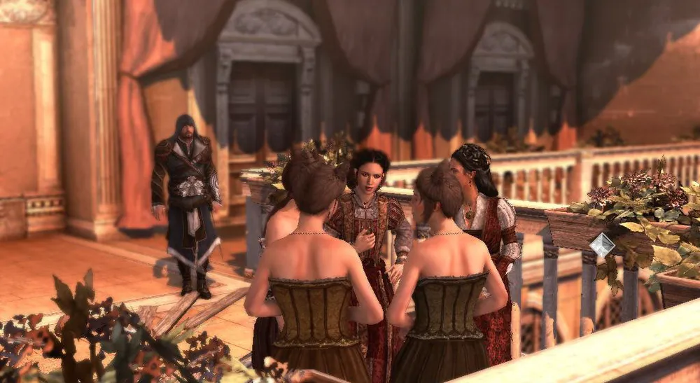 Милая девушка жалуется на то, что ей некому помочь отнести цветы для вечеринки, посвященной Дню Рождения Клаудии Аудиторе. Эцио добродушно соглашается. Несем цветы (Shift - взять предмет), следуя за девушкой. Девушка намекает, что ей нужен спутник, а тот, что сейчас с ней – очень шикарный и своей гордой походкой может сравниться только с Эцио. Помощник признается кто он. Девушка пугается, что проболталась. Эцио ловит момент и намекает на вознаграждение за молчание. Девушка просит его придти за вознаграждением завтра.