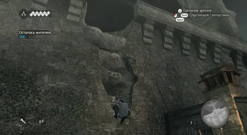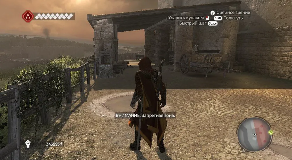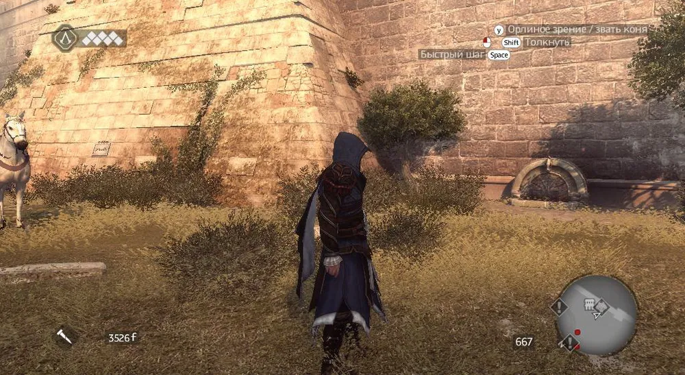 Эцио мчится на коне к южной стене, а на интерфейсе мелькает счетчик, что количество людей на вилле стремительно уменьшается. Не паникуем и едем дальше. По дороге нам этот же интерфейс сообщает, что мы теряем нашу броню и оружие. Все вокруг валится и, наконец, Эцио запрыгивает на стену.