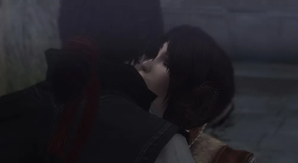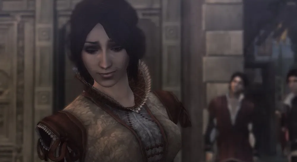 Эцио подбрасывает Кристине записку и ждет ее в назначенном переулке. Когда девушка приходит, он, не снимая маски, целует ее.