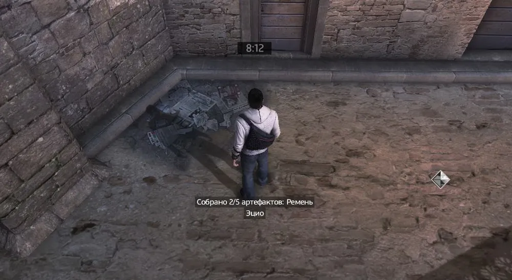 От стрелков на стенах Эцио получает ранение в плечо. Наемники тащат его к выходу, но снова нас настигают вездесущие солдаты. Спешим на помощь Клаудии. Убиваем сперва того, кто нападает на сестру – красная стрелочка. Кто нам мешает по дороге, уничтожаем и следуем за сестрой в святилище. Эцио запирает вход в подвал, но один человек без глаза с нами не пошел. Запомните его.