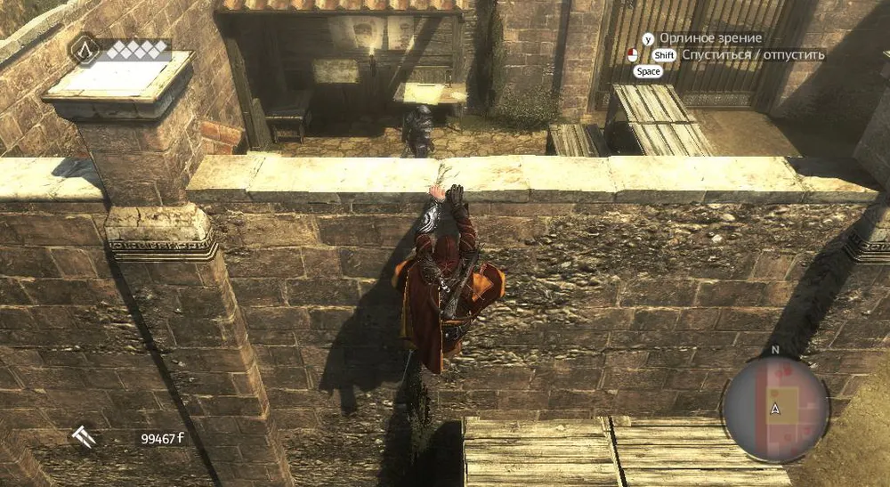 Дезмонд видит призраки Эцио и людей, покидающих стены виллы. Сворачивать некуда, так что бежим вперед, прыгая по стенам. По пути используем подсвеченные рычаги. Нам встречается новое (по сравнению со второй частью) очень забавное приспособление – средневековый лифт. Подсаживаем на себе Люси. Мы его правда уже встречали, когда Эцио помогал оборонять родной дом от нападения, но вряд ли в бою успели заметить что это, и в полной мере насладиться девайсом. Впереди разрушенный мост и на другую сторону не допрыгнуть. Люси прыгает через голову Деза, опускает одну из перекладин, куда мы и сможем долететь. Если упадете, всегда можно вернуться к исходной точке – тупиков в игре нет.