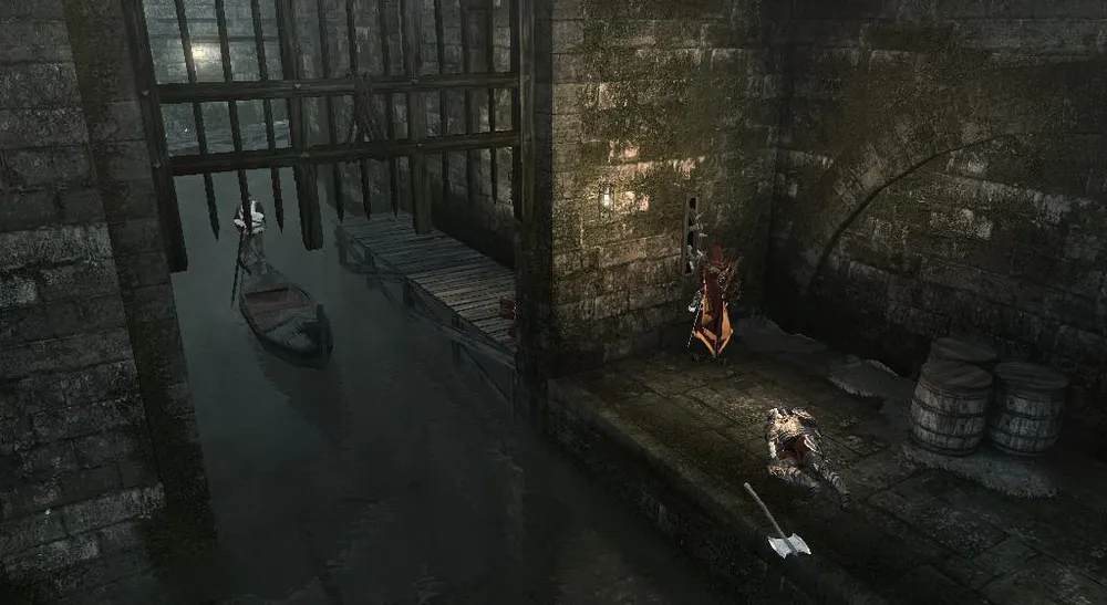 Эцио видит вход в подземелье и прыгает туда, откуда пришли эти бандиты. Сперва нам нужно заполнить фонтан, а для этого повернуть четыре рычага: