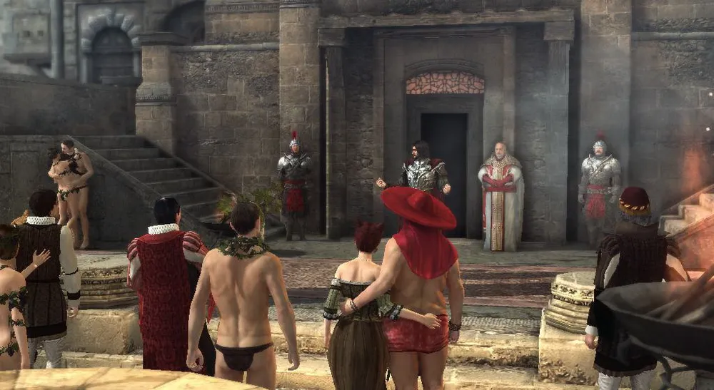 Катерина хочет продолжения, но не тут-то было. Как всегда на самом интересном месте удовольствие прервалось, ибо в окно влетело пушечное ядро. Эцио едва успевает натянуть рубашку и штаны, Катерина обещает собрать своих людей и по ту сторону дырки в стене мы видим, что на виллу напали.