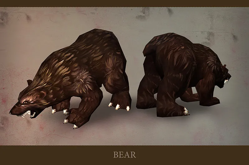 Медведи обитают преимущественно в лесах, но прекрасно чувствуют себя и в любой другой местности, они практически всеядны. В бою медведь способен принять на себя множество ударов врагов и, несмотря на ранения, продолжать борьбу. Медлителен и неповоротлив, но это во многом компенсируется его большой живучестью. Относительно легко поддается дрессировке.