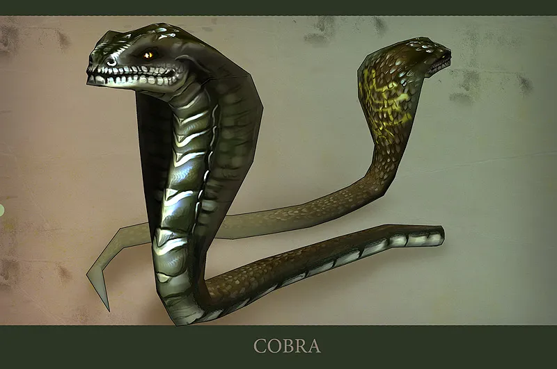 Гигантская змея одинаково хорошо чувствует себя в постоянной сырости болот и на раскаленном солнцем песке пустынь. В бою кобра быстра и смертоносна, она осыпает врага градом молниеносных ударов, увернуться от которых очень непросто, и каждый из них поражает цель ядом. Приручить кобру задача не из легких, но затраченные усилия окупятся с лихвой.