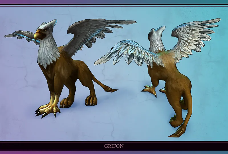Природа происхождения грифона доподлинно неизвестна, однако он по праву является одним из сильнейших и опаснейших хищников. В бою грифон свиреп и бесстрашен, мощный клюв и острые когти помноженные на огромную силу этого существа, делают каждый его удар поистине сокрушительным. Гордые и свободолюбивые существа грифоны очень плохо поддаются дрессировке и исключительно разборчивы в еде, далеко не каждый сможет приручить и воспитать грифона.