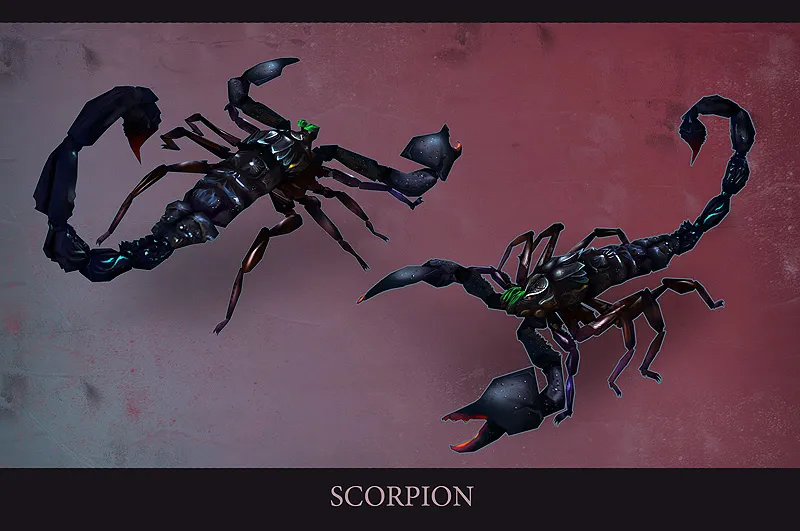 Вотчина скорпиона - пустыня и приграничные с ней степи. В бою скорпион исключительно эффективно действует как ядовитым жалом, так и мощными клешнями. Яд скорпиона обладает также паралитическим действием - он снижает парирование и защиту цели. Однако скорпион очень своенравное животное, он разборчив в еде и плохо поддается дрессировке, содержание его может доставить много хлопот.