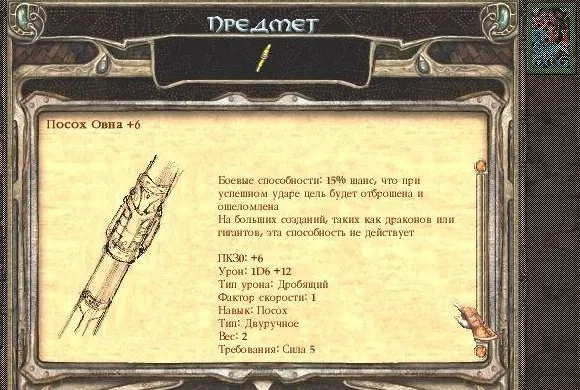 Первыми на нашем пути, буквально сразу после выхода на поверхность, в «Ярмарке приключений», встретятся сразу два из них: «Посох Ринна +4» и посох-булава. Оба они, помимо высокой скорости использования, обладают неплохим уроном – 1D 6+4 и 2D4+2 соответственно, причём посох-булава может быть использован в комплекте со щитом.