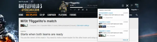 Функция "Matches" будет доступна для всех игровых платформ: ПК, Xbox 360 и PS3. Если у вас в управлении есть арендованный выделенный сервер Battlefield 3, значит вы сможете создать свой матч, между командами своих друзей или в рамках какого-либо турнира.