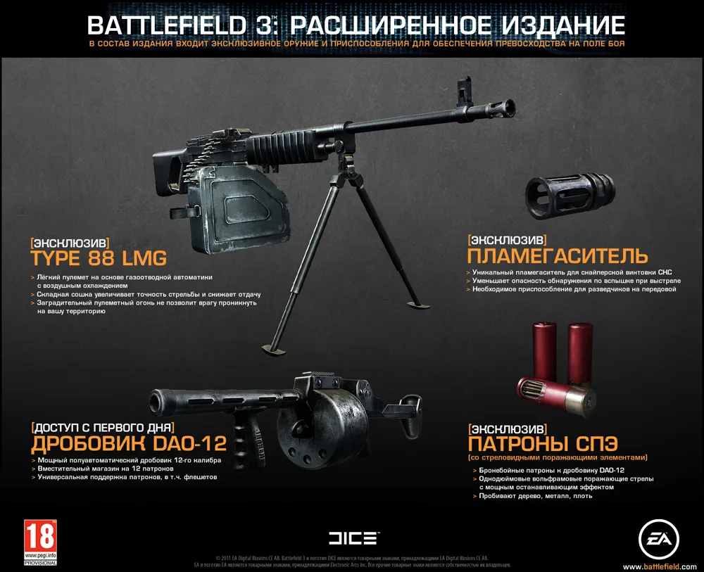 В блоге DICE появилась запись, подтверждающая, что дополнение Physical Warfare Pack позже будет доступен всем игрокам. До этого дополнение было анонсировано как эксклюзив, для предзаказавших Battlefield 3 однако увидев негативную реакцию фанатов EA решили сделать дополнение лишь временным эксклюзивом. Это значит, что предзаказавшие игру получат оружия из DLC с первого дня игры, остальным же придётся подождать.