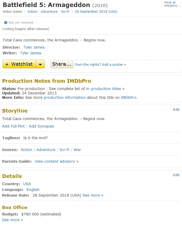 Если верить сайту imdb.com, то 28 сентября 2018 года на свет выйдет пятая часть Battlefield с подзаголовком "Armageddon'. На сайте также засветился слоган игры: "Total Caos commences, the Armageddon. - Begins now."