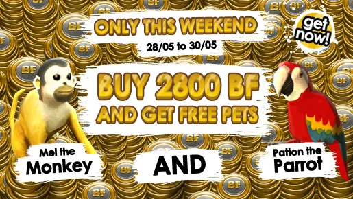На этих выходных, с 28 по 31 мая при покупке 2800 Баттлфунтов вы получите коды на обезьянку и попугая совершенно бесплатно! Раньше эти животные были доступны только через Supply Drop'ы.