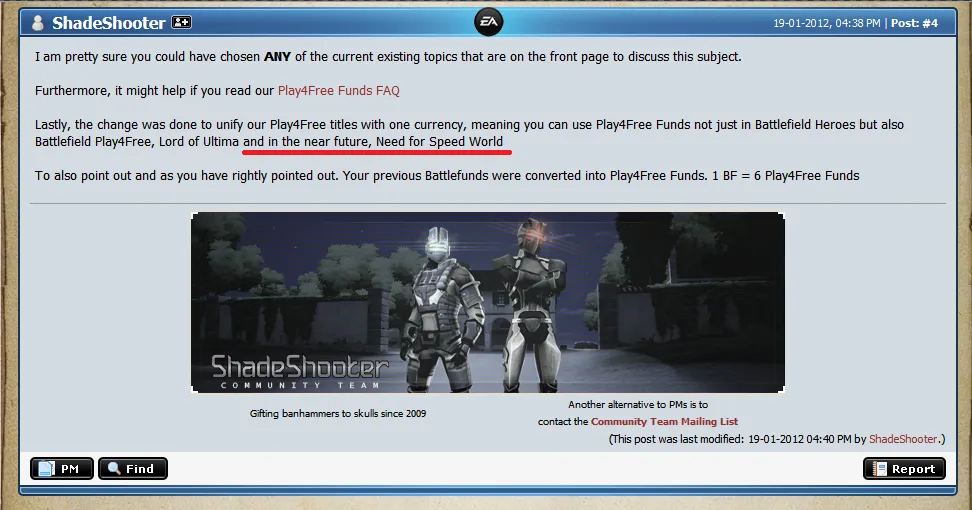 '18 января 2012 года Battlefunds были сконвертированы в новую единую валюту – Play4Free Funds. С этого момента вы сможете использовать одну и ту же валюту в Battlefield Heroes, Battlefield Play4Free и Lord of Ultima.