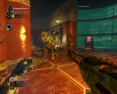 Ну вот, со структурой разобрались, перейдем к более мелким деталям. Как и прежде, сюжет передается нам посредством сбора многочисленных аудиозаписей. Среди них нередко попадаются довольно интересные подробности, но все-таки скажу откровенно - такой подход успел приесться еще лет пять назад. Первые уровни - это самая скучная часть игры. И еще какая: почти никакого оружия, пара плазмидов да скучные противники. Все как в первой части, вот только она-то уж не первая. Непонятно, зачем два раза повторять один и тот же трюк, отбирая у нас оружие, ведь нового - кот наплакал. Да и плазмиды не радуют оригинальностью. Почти всю первую половину игры вы будете скучать, отстреливаясь на одних только рефлексах, почти совсем не продумывая свои действия. Потом, когда арсенал наконец наполнится более-менее прилично, наконец действительно появится резон заниматься тактикой. Там же и хитрые враги подоспеют, и плазмиды с "тонизирующими средствами" подвезут. Последние - это перки, знакомые нам по ролевым играм. Они дают те или иные бонусы, например увеличивают количество переносимых аптечек. О да - аптечки. С прискорбием сообщаю: никакого автоматического восстановления здоровья а ля Call of Duty в BioShock 2 не завезли. Помимо красной шкалы здоровья, присутствует синяя шкала "Евы" - она расходуется на плазмиды. Сами плазмиды - это, например, телекинез, позволяющий швырять предметы на расстоянии, предварительно притянув их к себе. Или самый настоящий пирокинез - способность воспламенять предметы на расстоянии. Однако, вот вам черпак дегтя: никакой корректной физики здесь и близко нет. Загораются лишь некоторые предметы окружения, враги и тела. Да и то не все. Также с помощью пирокинеза можно растопить лед, но опять же не весь, а только специально для того предназначенный. И так во всем. Что до разрушаемости, то её здесь нет вообще. Устроить погром не получится при всем желании. Не говоря уже о том, как от этого страдают сражения. Помимо прочего, тут можно есть что-попало и пить алкоголь в немереных количествах. Нет, опьянение, конечно, будет, но оно не то чтобы представляет интерес. Экран пошатает туда-сюда, в глазах будет двоиться, зато ходить вы будете по идеальной прямой. Еще повсюду разбросаны деньги, которые можно тратить в специальных киосках. В них можно купить патроны, аптечки и Еву. Не брезгуйте этой возможностью - денег тут много, и больше шести сотен за раз унести нельзя. Также не забывайте взламывать их. Мини-игра по взлому, кстати, новая: нужно вовремя остановить стрелку в синей, или если таковой нет, в зеленой зоне. Если угодите в красную - прилетят вертолетики охраны. С последними все также привычно: попадетесь на взломе, или просто вас увидит камера охраны, и за вами будет выпущена боевая пара роботов-вертолетиков. Все это дело можно взломать, и заставить служить на благо себе.