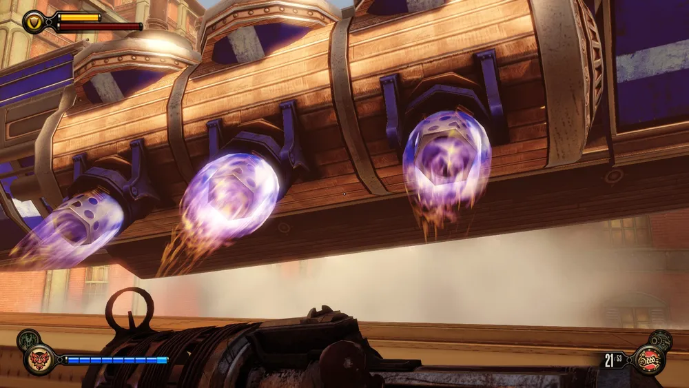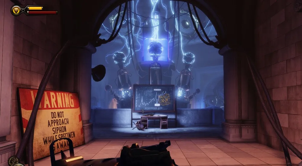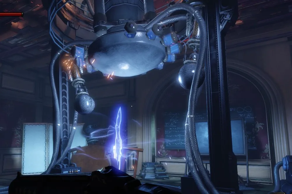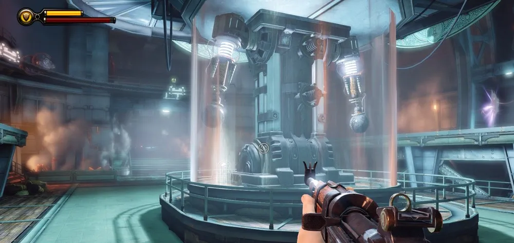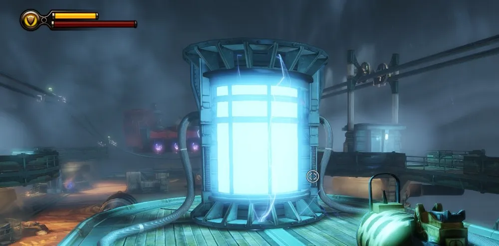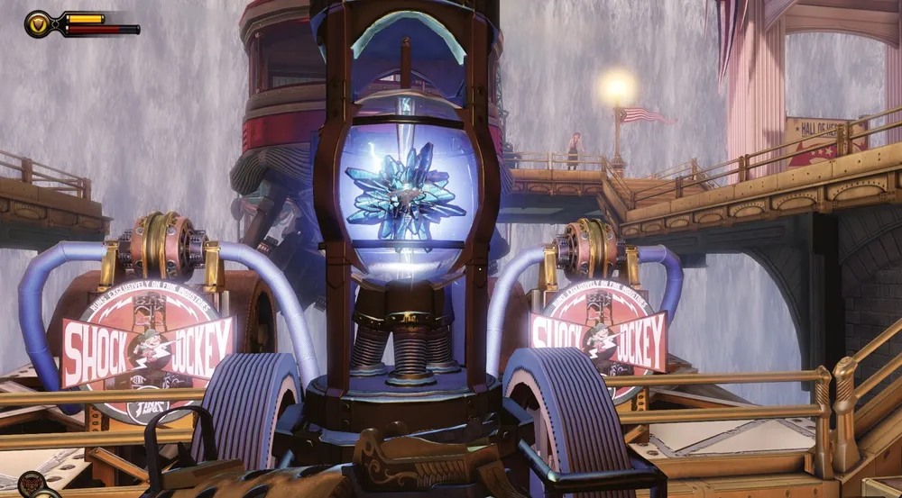 В башне Монумента и потом, в доме Комстока, также можно увидеть странные источники электрической энергии – колбы с кристаллами Шок Жокея передают свою высвобожденную энергию на электростатические шары (хотя зачем?) и какие-то трансформаторы. Использование ее в духе того времени – с разрядами в воздухе и угрожающим гудением.