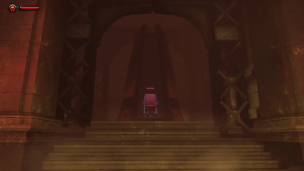 Итак, мы заходим в нее и никуда пока не поднимаемся. Мы как бы на первом этаже, ходим по нему возле оборудования и таблиц. Но потом когда мы проходим вокруг помещений, комнат Элизабет, все же поднимаемся на пару пролетов… но не таких уж длинных. И когда пытаемся пройти в библиотеку, мы уже оказываемся на большой высоте, в голове монумента.